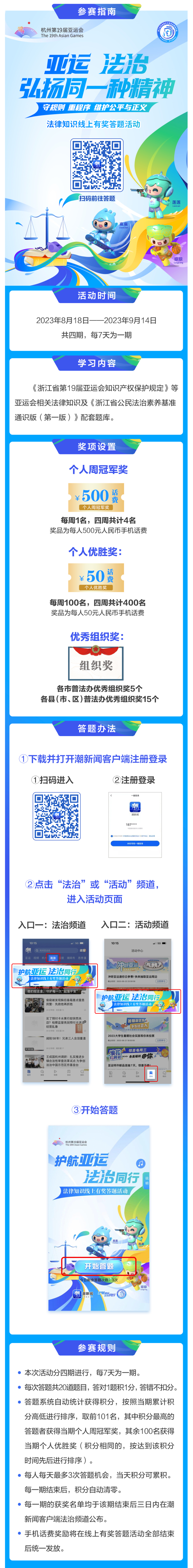 亞運(yùn)法律知識(shí)線上有獎(jiǎng)答題活動(dòng)已于818日在“潮新聞”客戶端正式開啟,具體情況如下: